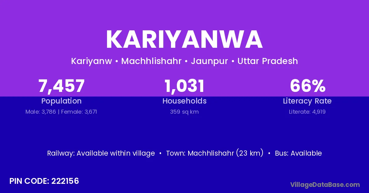 Machhlishahr (23 km) is the nearest town to Kariyanwa village for major economic activities and is located approximately 23 km away.