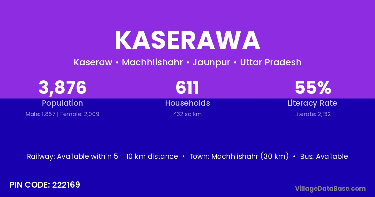 Machhlishahr (30 km) is the nearest town to Kaserawa village for major economic activities and is located approximately 30 km away.