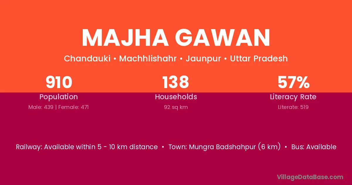 Majha Gawan village has a total population of 910 people, of which 439 are males and 471 are females.