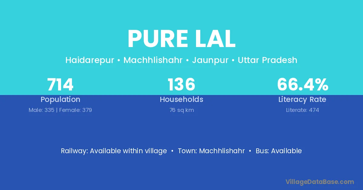 Pure Lal village has a total population of 714 people, of which 335 are males and 379 are females.