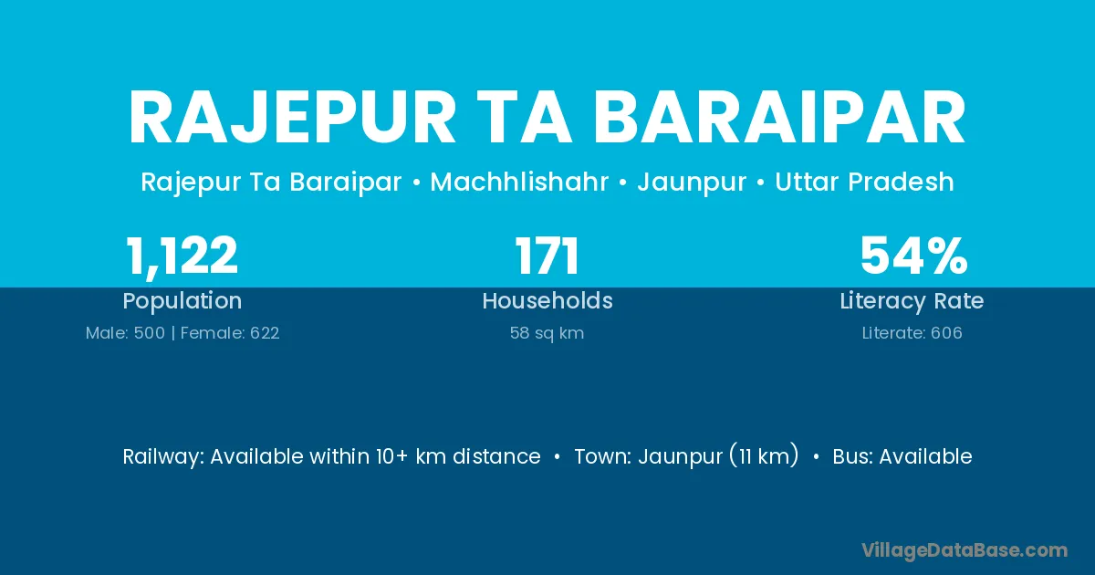 Jaunpur (11 km) is the nearest town to Rajepur Ta Baraipar village for major economic activities and is located approximately 11 km away.