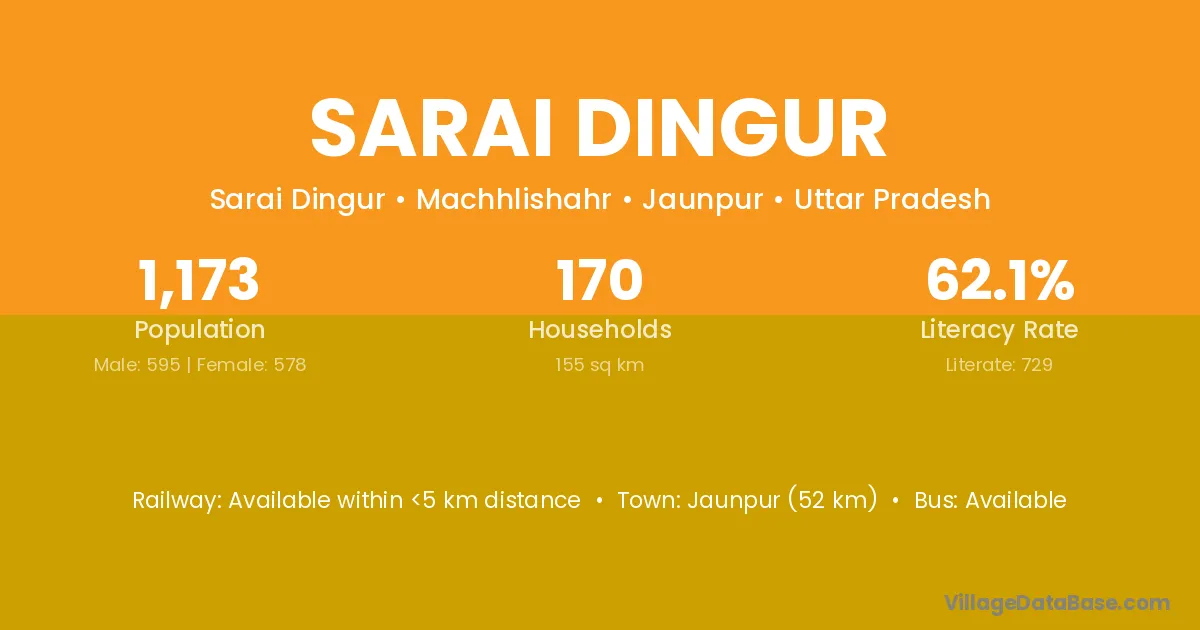 Jaunpur (52 km) is the nearest town to Sarai Dingur village for major economic activities and is located approximately 52 km away.