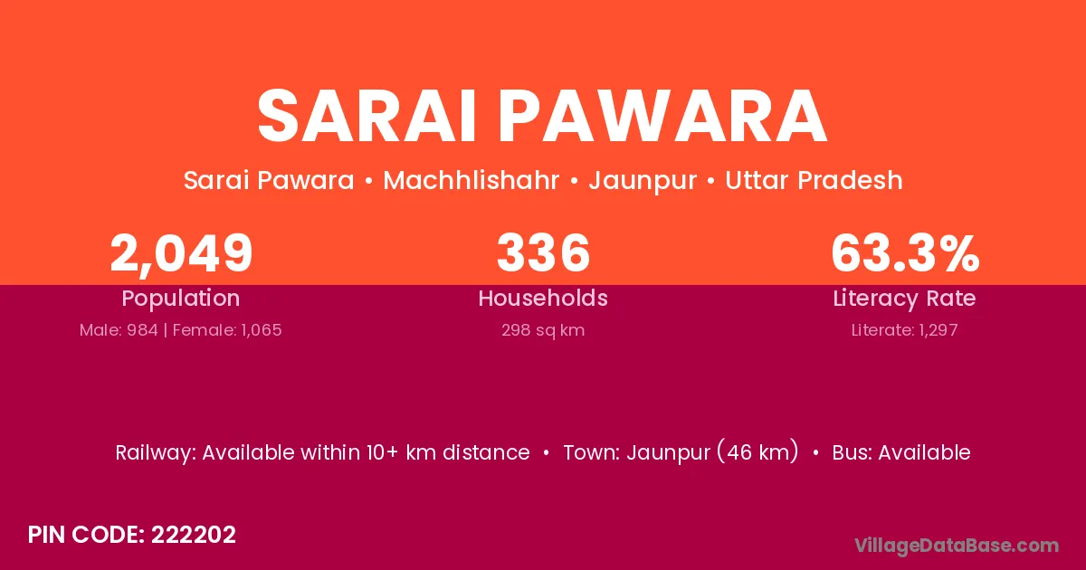 Jaunpur (46 km) is the nearest town to Sarai Pawara village for major economic activities and is located approximately 46 km away.