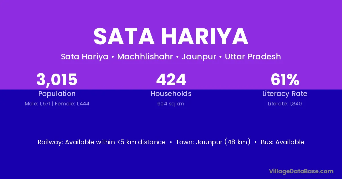 Jaunpur (48 km) is the nearest town to Sata Hariya village for major economic activities and is located approximately 48 km away.