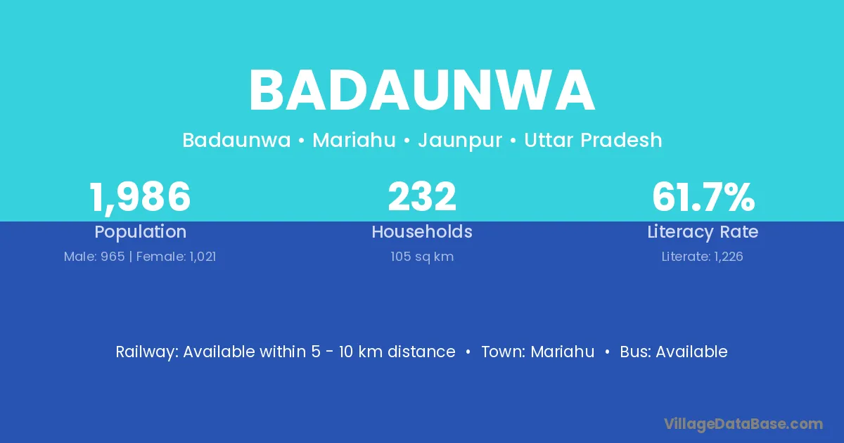 Badaunwa village has a total population of 1,986 people, of which 965 are males and 1,021 are females.