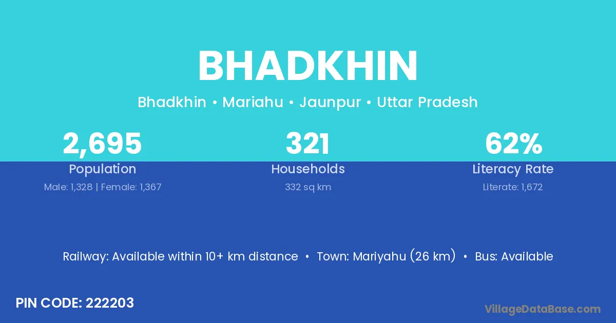 Mariyahu (26 km) is the nearest town to Bhadkhin village for major economic activities and is located approximately 26 km away.