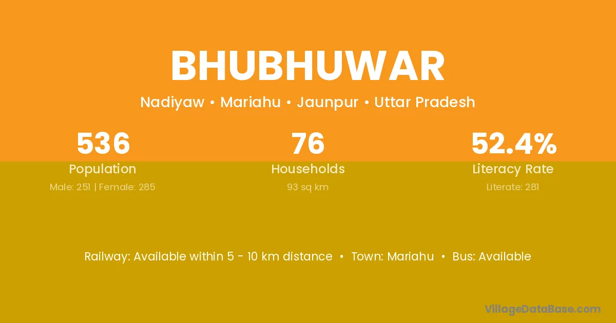 Bhubhuwar village has a total population of 536 people, of which 251 are males and 285 are females.