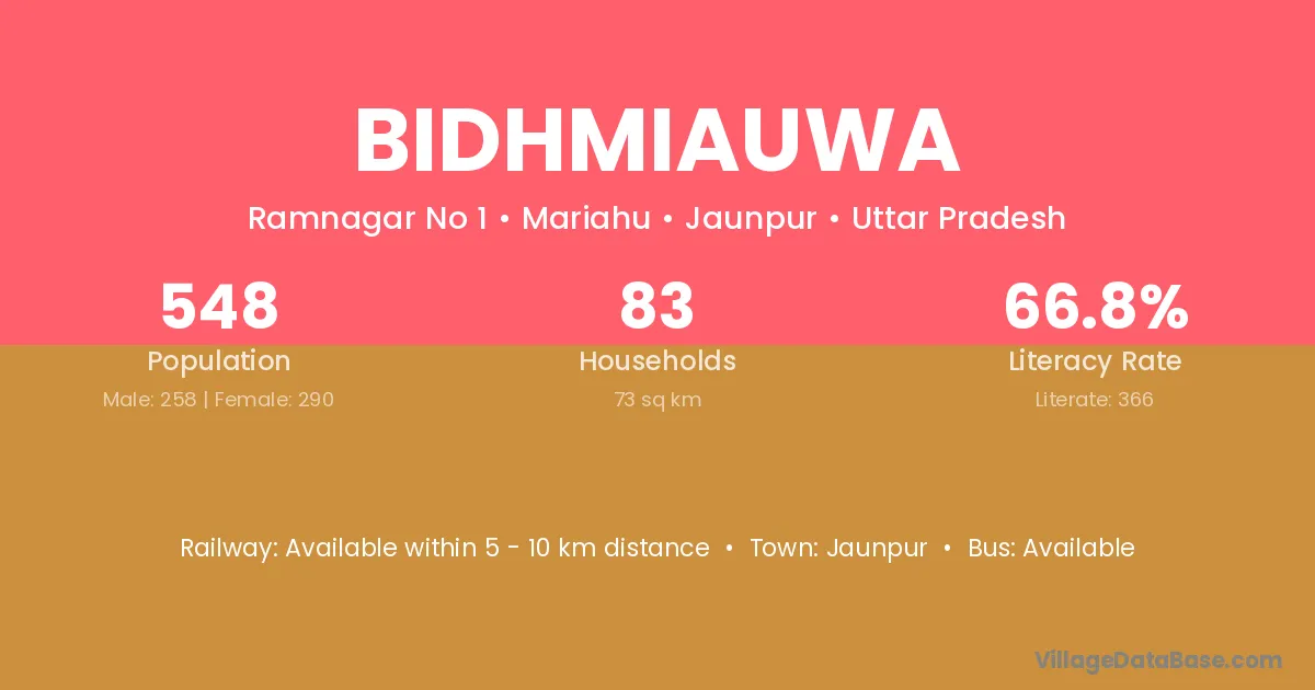 Bidhmiauwa village has a total population of 548 people, of which 258 are males and 290 are females.