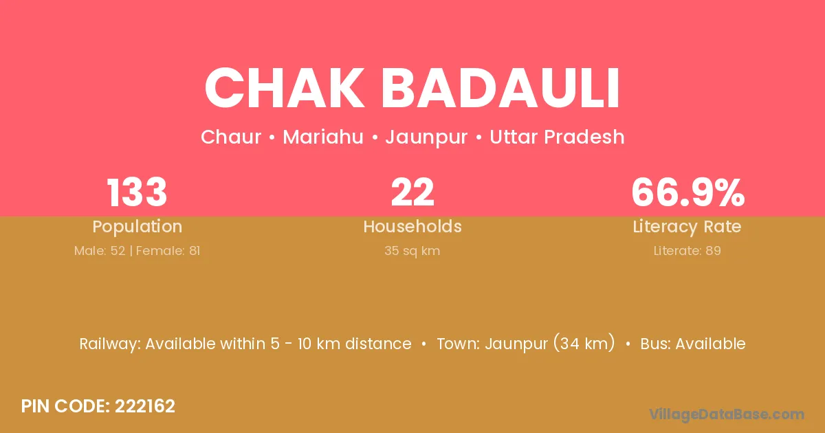 Jaunpur (34 km) is the nearest town to Chak Badauli village for major economic activities and is located approximately 34 km away.