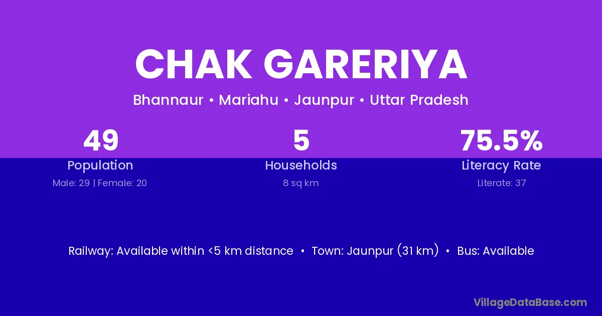 Jaunpur (31 km) is the nearest town to Chak Gareriya village for major economic activities and is located approximately 31 km away.