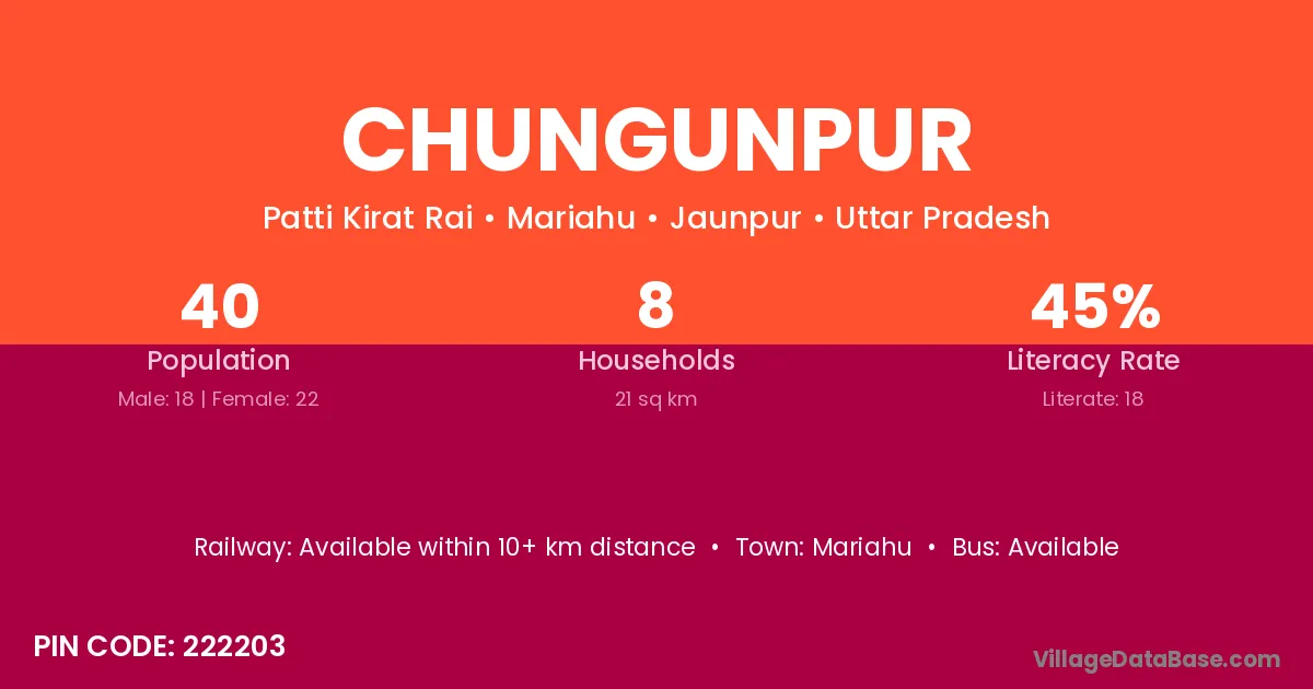 Chungunpur village has a total population of 40 people, of which 18 are males and 22 are females.