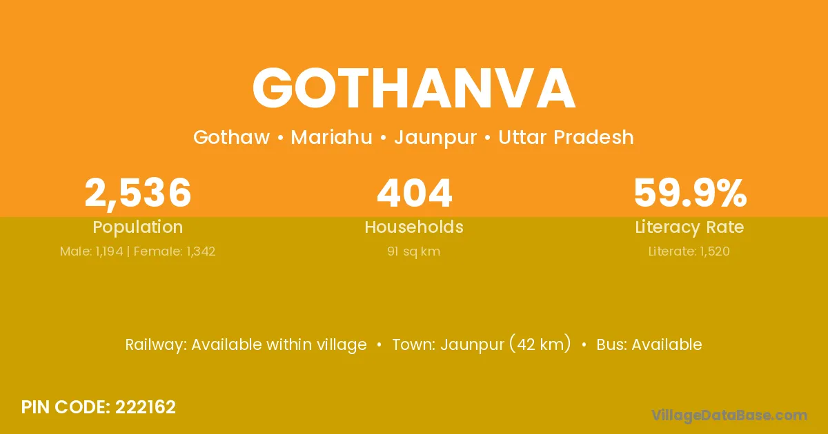 Jaunpur (42 km) is the nearest town to Gothanva village for major economic activities and is located approximately 42 km away.