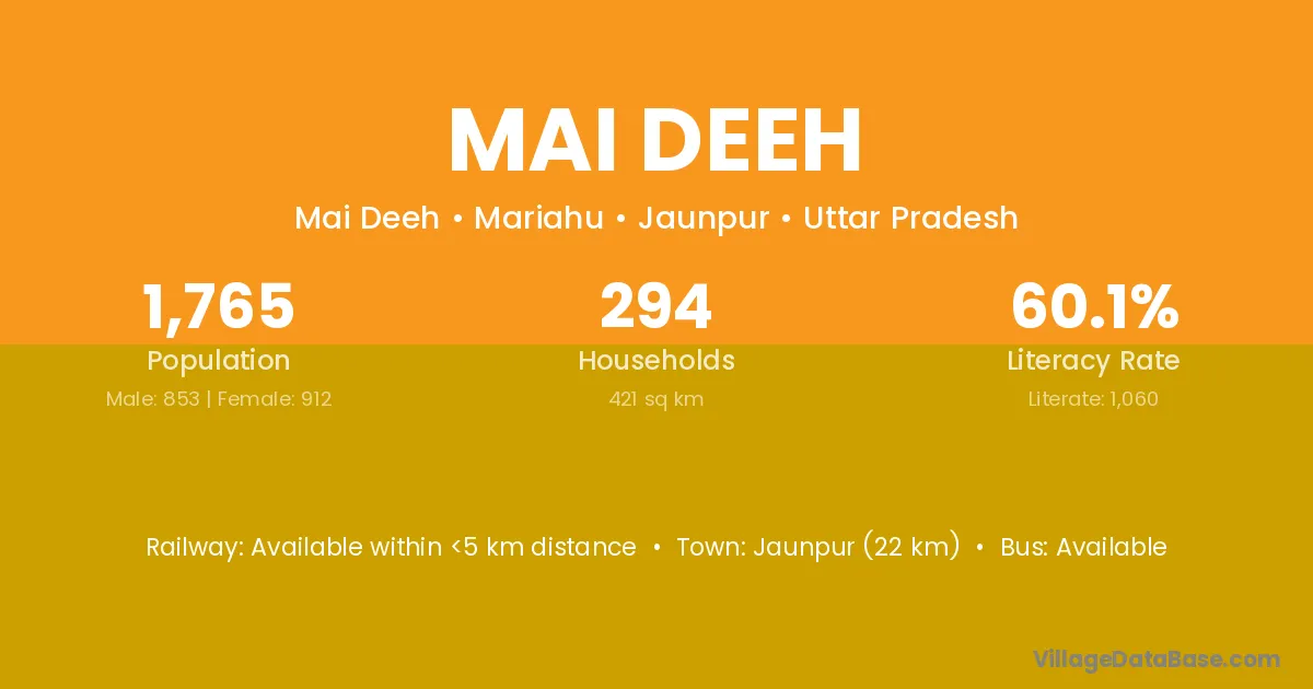 Jaunpur (22 km) is the nearest town to Mai Deeh village for major economic activities and is located approximately 22 km away.