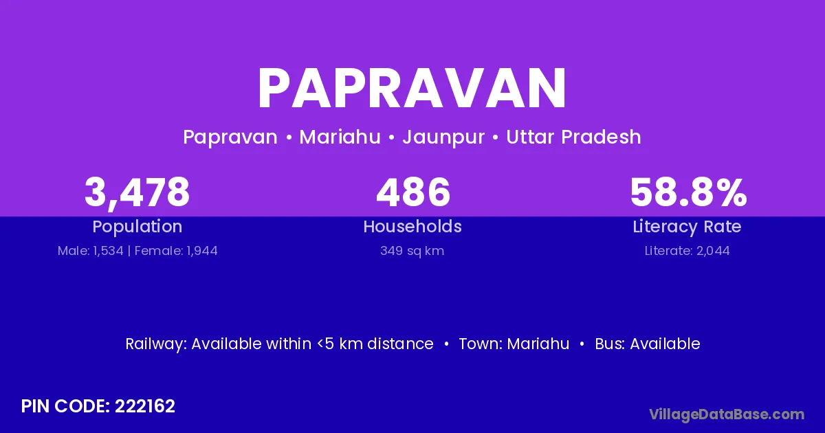 Papravan village has a total population of 3,478 people, of which 1,534 are males and 1,944 are females.