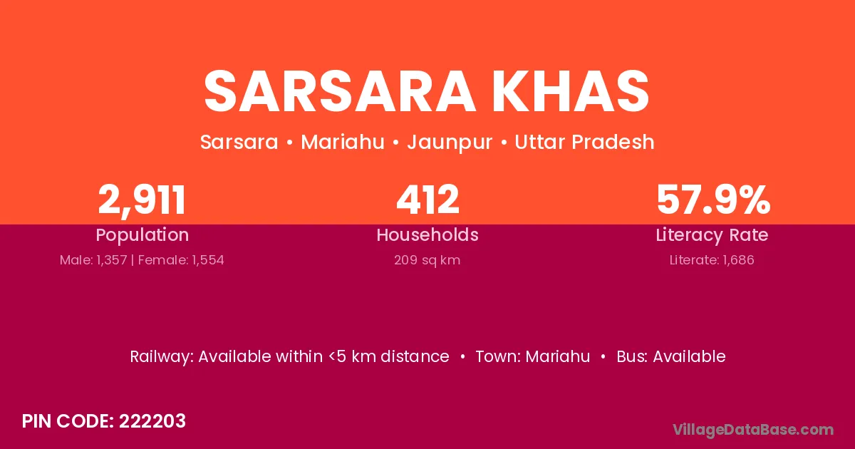 Sarsara Khas village has a total population of 2,911 people, of which 1,357 are males and 1,554 are females.