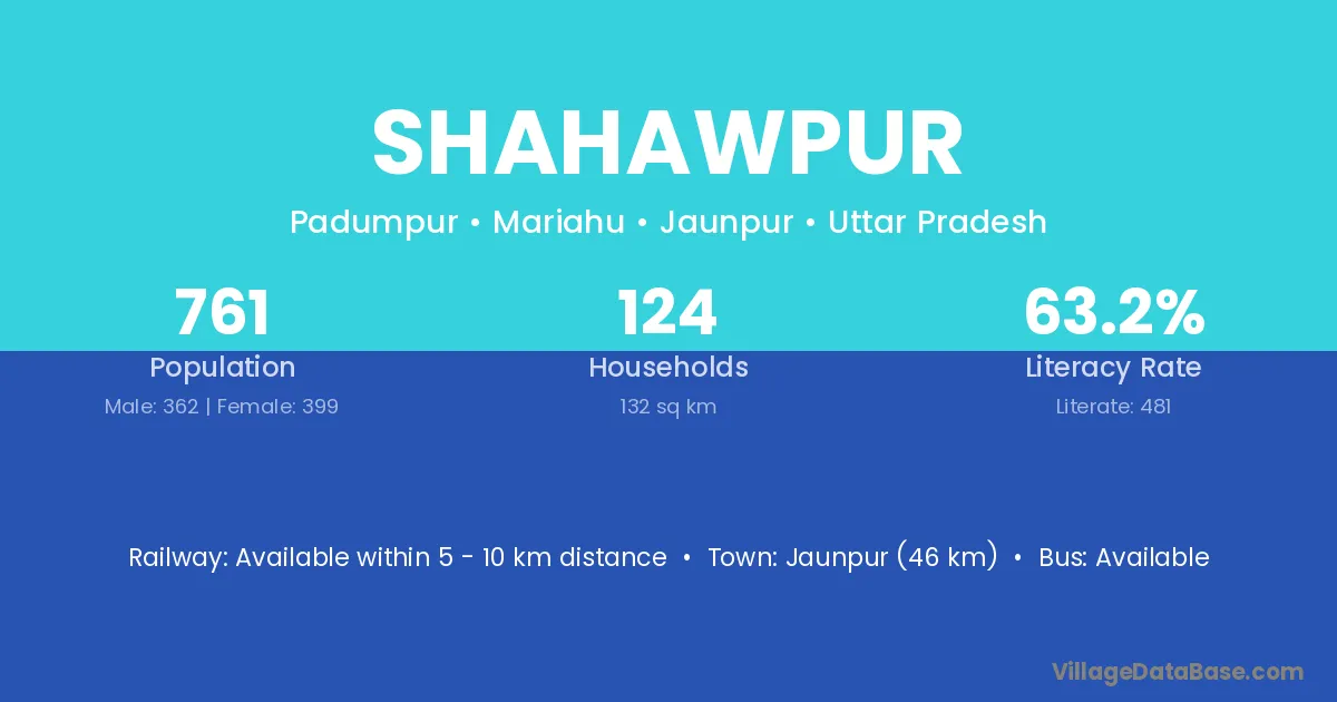 Jaunpur (46 km) is the nearest town to Shahawpur village for major economic activities and is located approximately 46 km away.