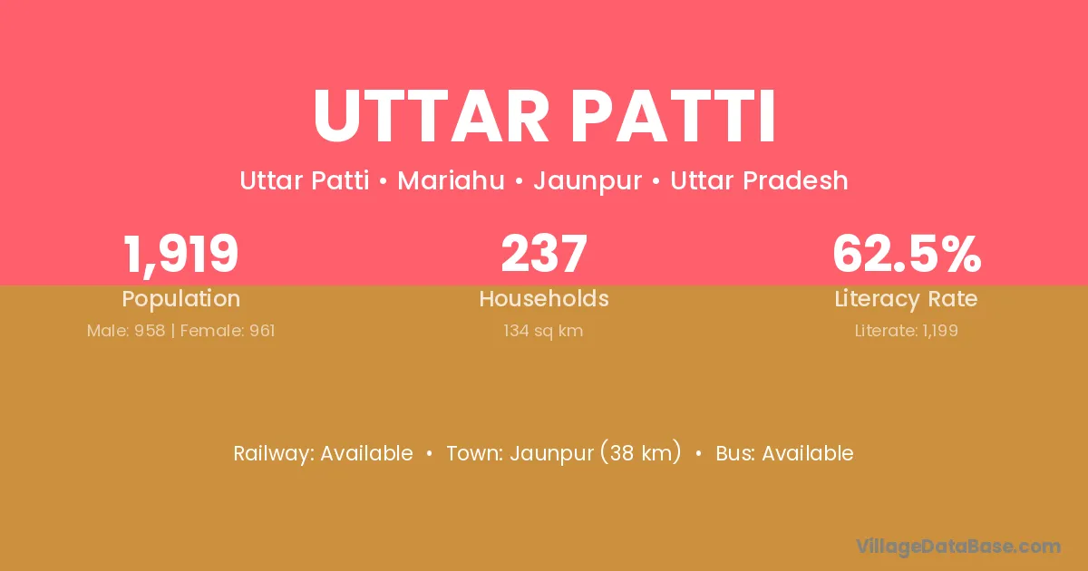 Jaunpur (38 km) is the nearest town to Uttar Patti village for major economic activities and is located approximately 38 km away.