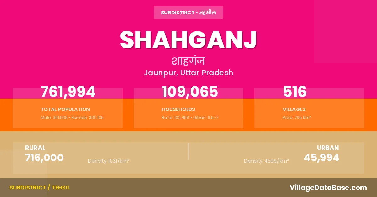 According to the 2011 census The total area of Shahganj Tehsil is 705 km², with a population of 761994 people. The population density is 1,082 inhabitants per square kilometre, and there are approximately 109065 houses in the sub district.
