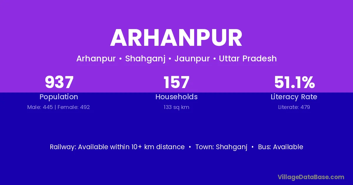 Arhanpur village has a total population of 937 people, of which 445 are males and 492 are females.