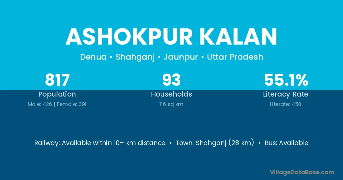 Shahganj (28 km) is the nearest town to Ashokpur Kalan village for major economic activities and is located approximately 28 km away.