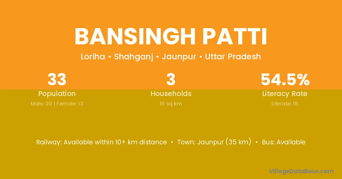 Bansingh Patti village has a total population of 33 people, of which 20 are males and 13 are females.