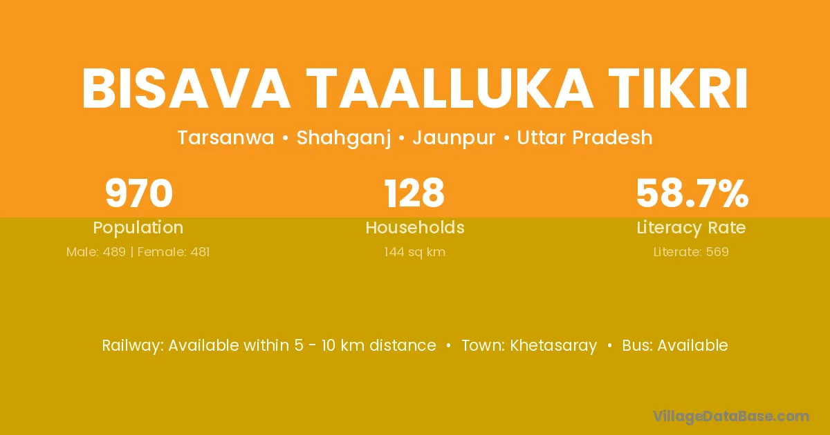 Bisava Taalluka Tikri village has a total population of 970 people, of which 489 are males and 481 are females.
