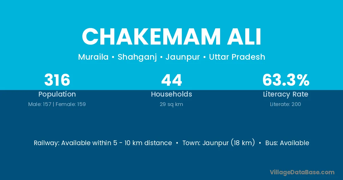 Jaunpur (18 km) is the nearest town to Chakemam Ali village for major economic activities and is located approximately 18 km away.