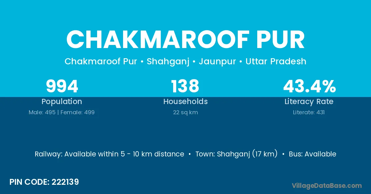 Shahganj (17 km) is the nearest town to Chakmaroof Pur village for major economic activities and is located approximately 17 km away.
