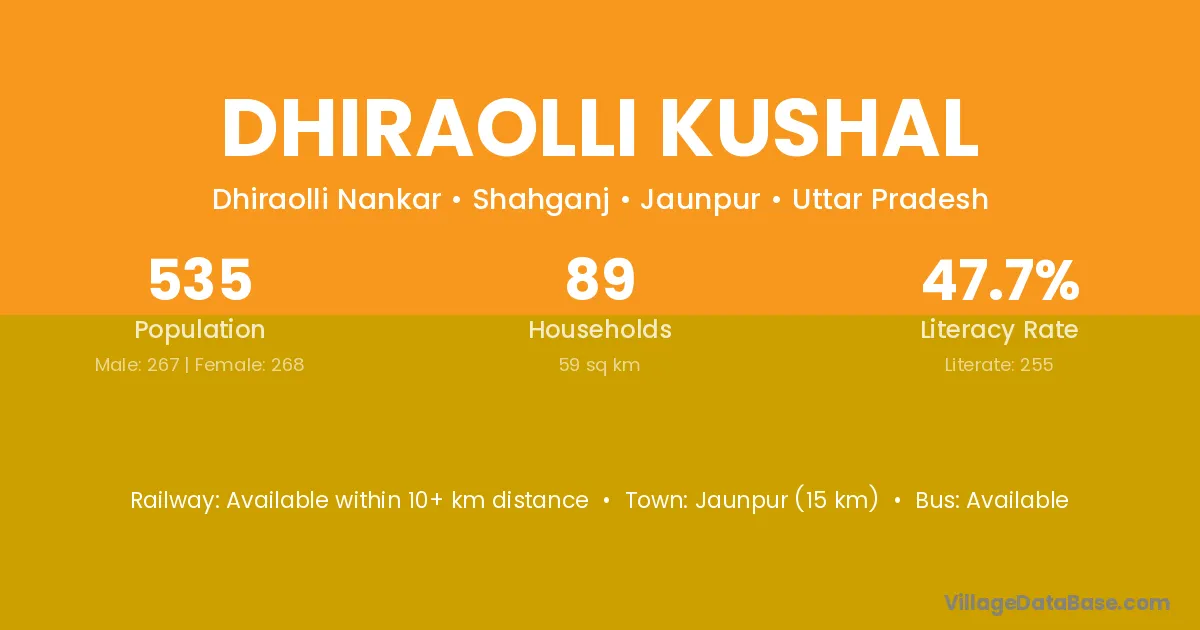 Jaunpur (15 km) is the nearest town to Dhiraolli Kushal village for major economic activities and is located approximately 15 km away.