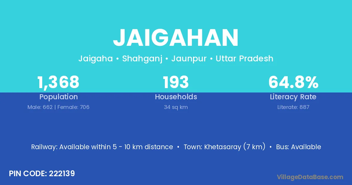 Jaigahan village has a total population of 1,368 people, of which 662 are males and 706 are females.