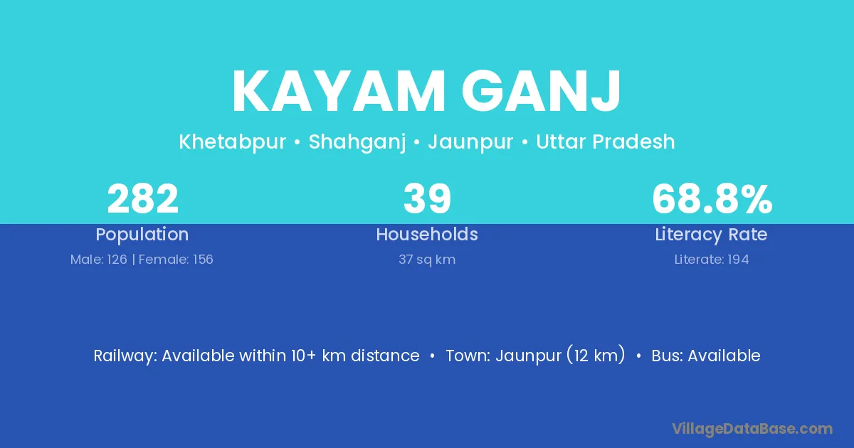 Jaunpur (12 km) is the nearest town to Kayam Ganj village for major economic activities and is located approximately 12 km away.