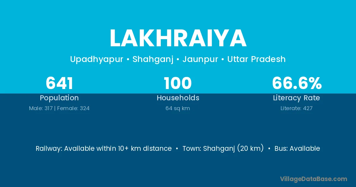 Shahganj (20 km) is the nearest town to Lakhraiya village for major economic activities and is located approximately 20 km away.