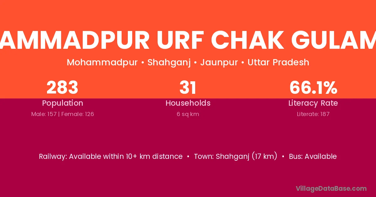 Shahganj (17 km) is the nearest town to Mohammadpur Urf Chak Gulamipur village for major economic activities and is located approximately 17 km away.