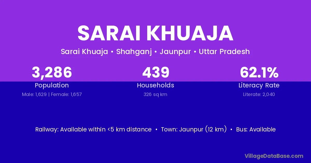 Jaunpur (12 km) is the nearest town to Sarai Khuaja village for major economic activities and is located approximately 12 km away.