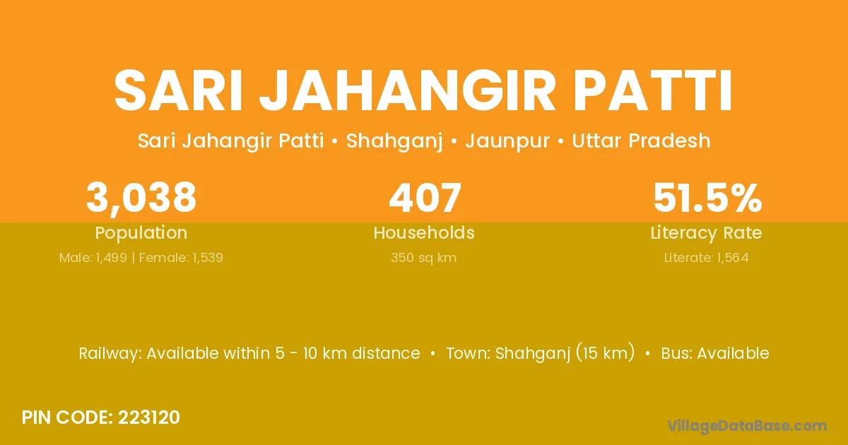 Shahganj (15 km) is the nearest town to Sari Jahangir Patti village for major economic activities and is located approximately 15 km away.