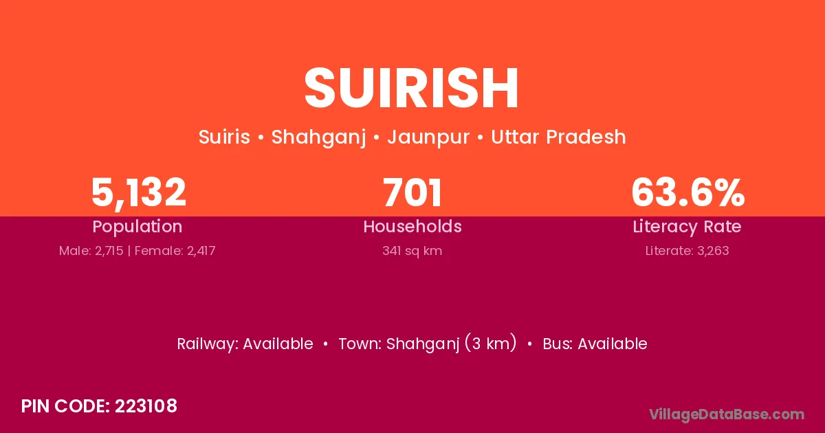 Shahganj (3 km) is the nearest town to Suirish village for major economic activities and is located approximately 3 km away.