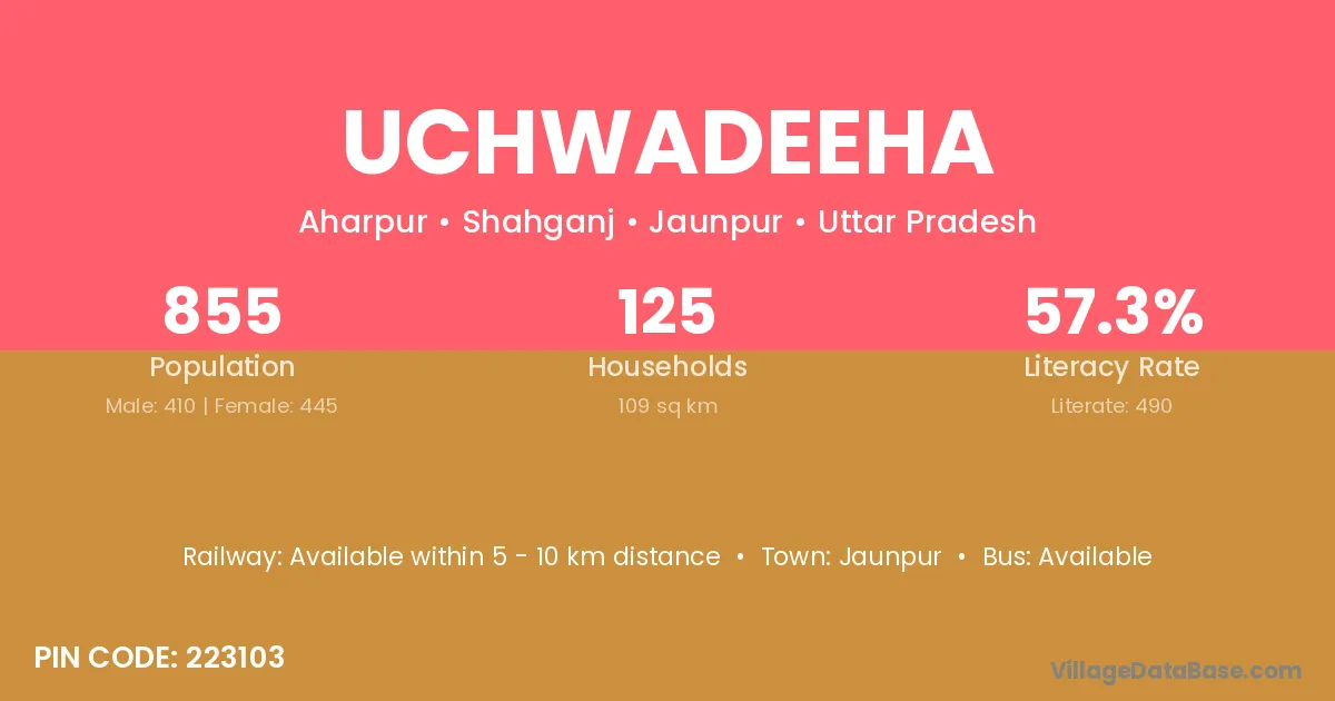 Uchwadeeha village has a total population of 855 people, of which 410 are males and 445 are females.