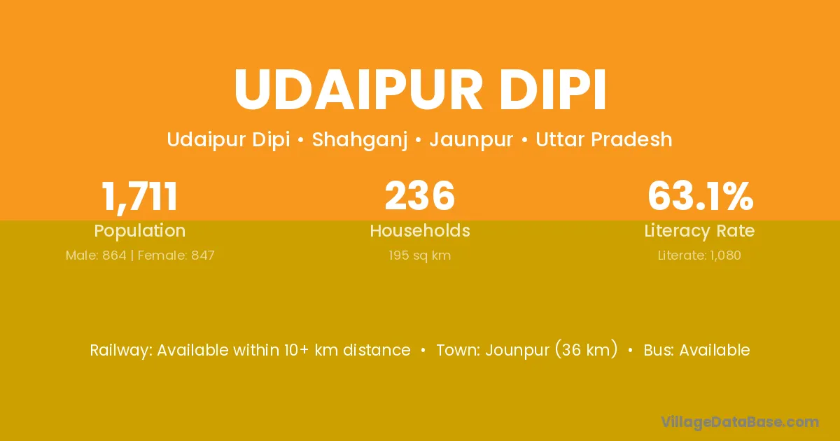 Jounpur (36 km) is the nearest town to Udaipur Dipi village for major economic activities and is located approximately 36 km away.