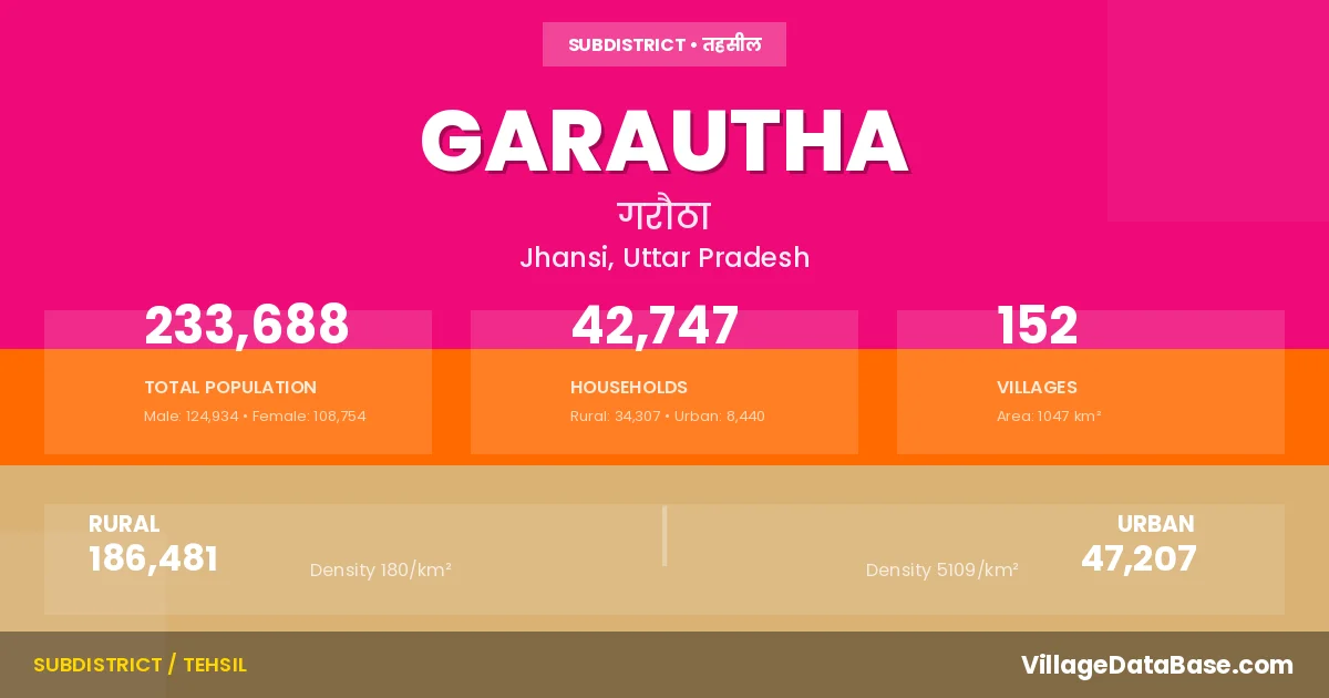 According to the 2011 census The total area of Garautha Tehsil is 1047 km², with a population of 233688 people. The population density is 223 inhabitants per square kilometre, and there are approximately 42747 houses in the sub district.