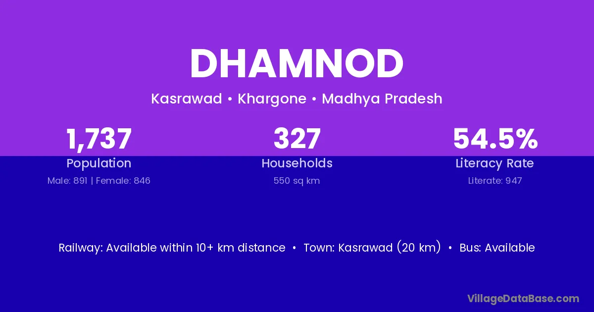 The literacy rate of Dhamnod village is 44.56%. Male literacy stands at 58.38% and female literacy at 27.69%.