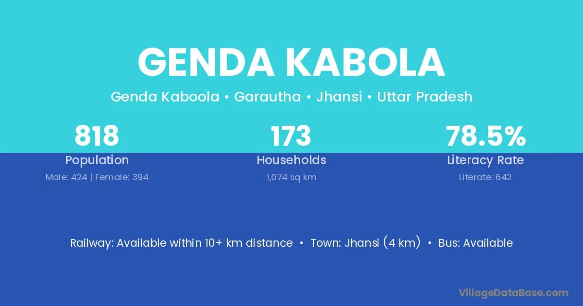 Jhansi (4 km) is the nearest town to Genda Kabola village for major economic activities and is located approximately 4 km away.