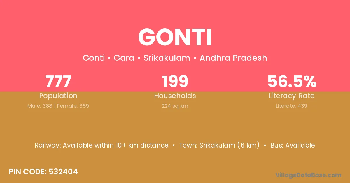 The literacy rate of Gonti village is 56.38%. Male literacy stands at 67.13% and female literacy at 43.24%.