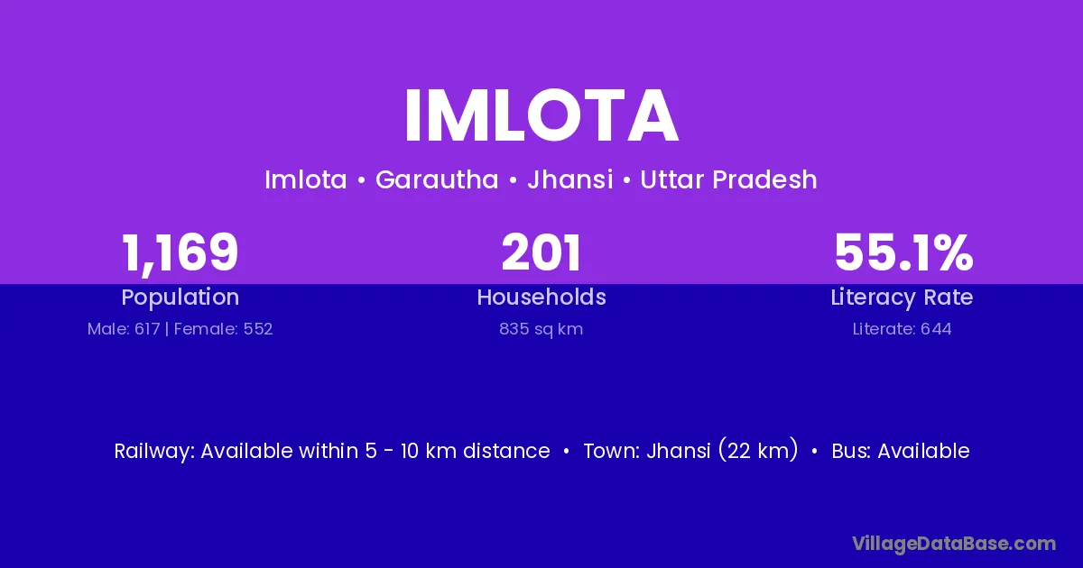 Jhansi (22 km) is the nearest town to Imlota village for major economic activities and is located approximately 22 km away.