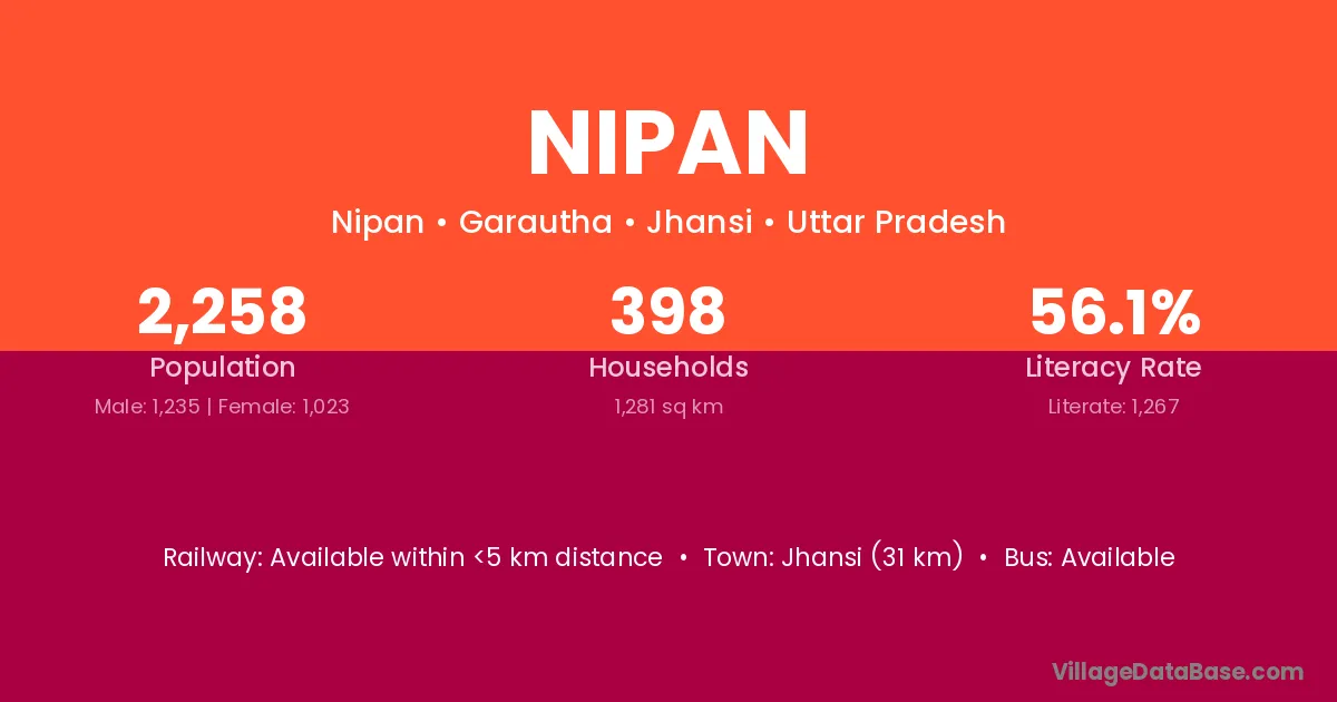 Jhansi (31 km) is the nearest town to Nipan village for major economic activities and is located approximately 31 km away.