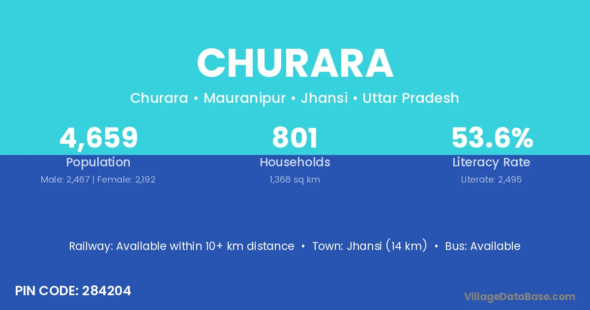 Jhansi (14 km) is the nearest town to Churara village for major economic activities and is located approximately 14 km away.