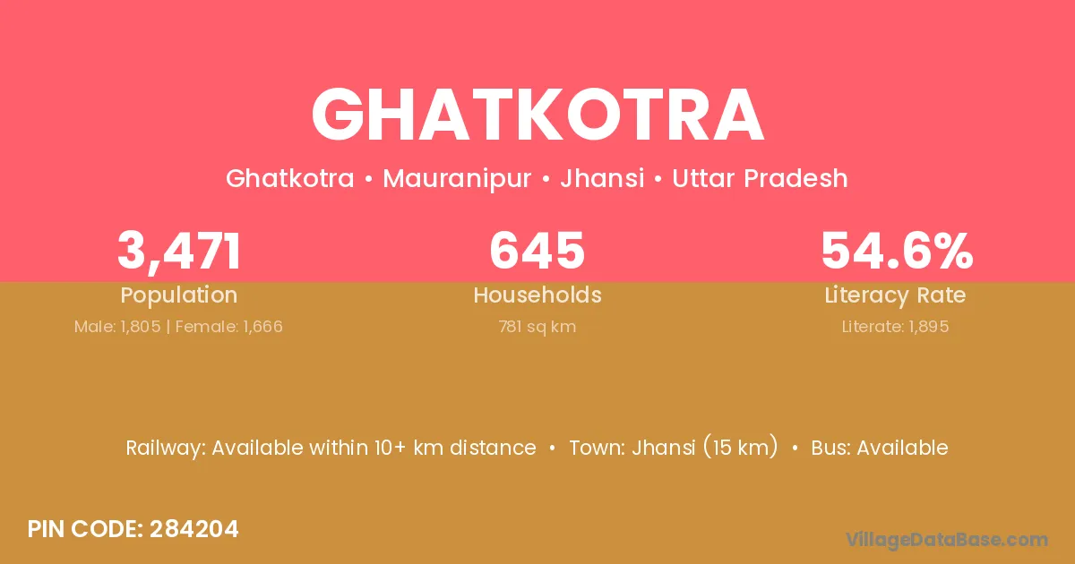 Jhansi (15 km) is the nearest town to Ghatkotra village for major economic activities and is located approximately 15 km away.