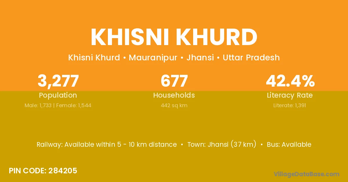 Jhansi (37 km) is the nearest town to Khisni Khurd village for major economic activities and is located approximately 37 km away.