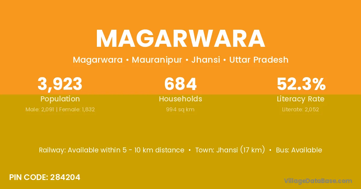 Jhansi (17 km) is the nearest town to Magarwara village for major economic activities and is located approximately 17 km away.