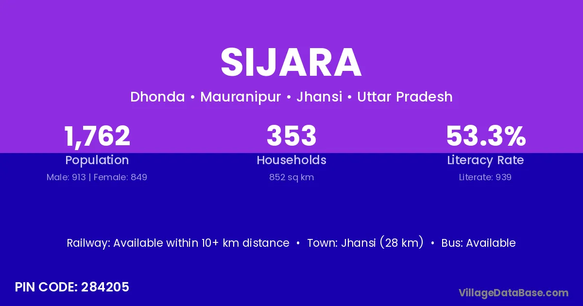 Jhansi (28 km) is the nearest town to Sijara village for major economic activities and is located approximately 28 km away.