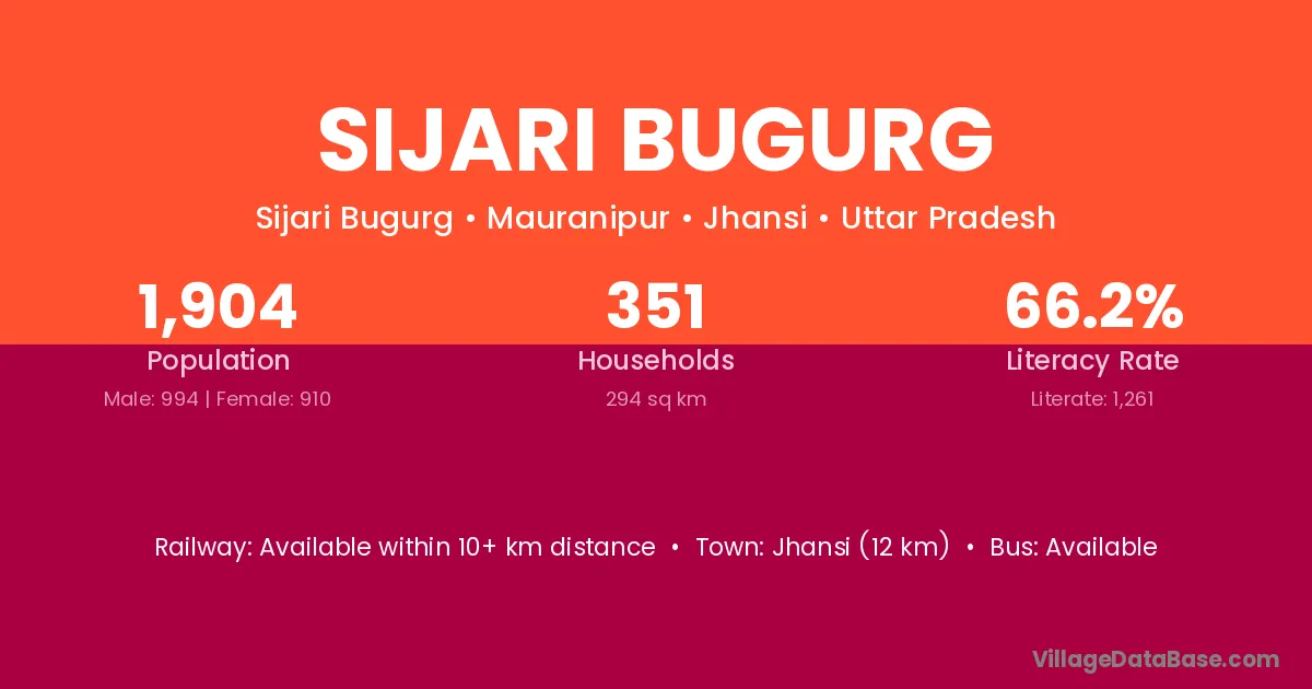Jhansi (12 km) is the nearest town to Sijari Bugurg village for major economic activities and is located approximately 12 km away.
